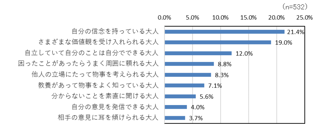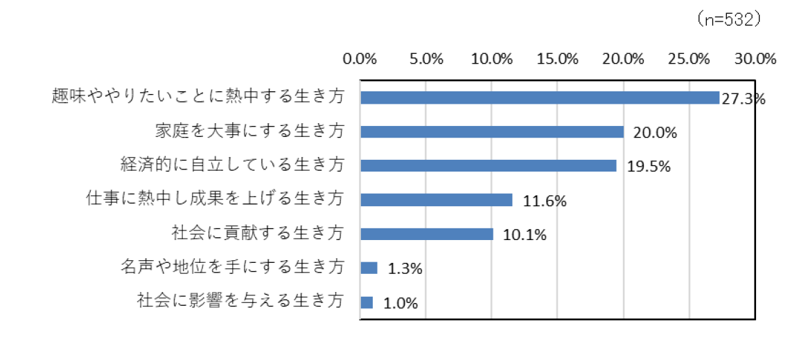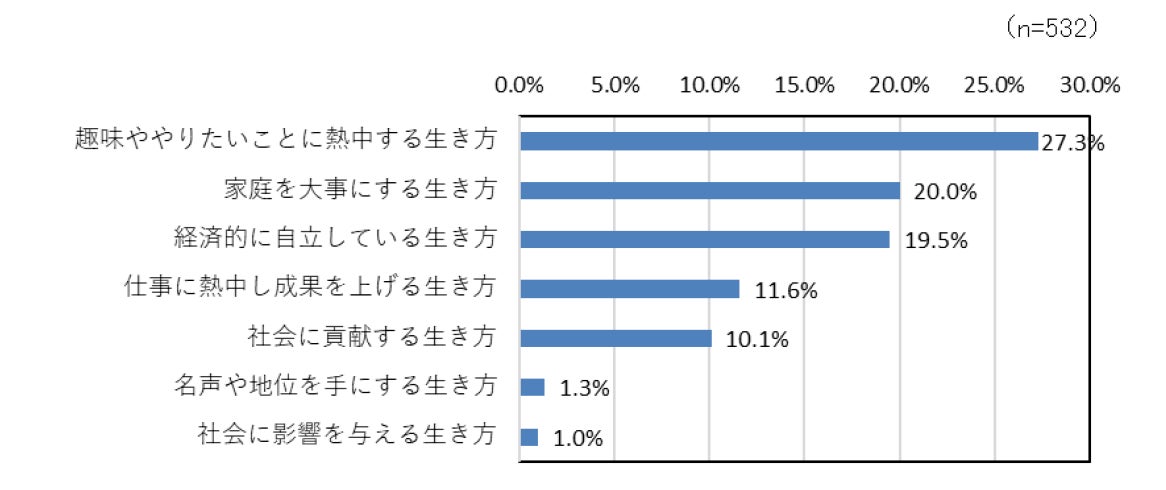 - 2022年の1月に成人式を迎える学生が最も理想とする生き方は「趣味ややりたいことに熱中する生き方」。なりたい大人像の上位は「自分の信念を持っている大人」「さまざまな価値観を受け入れられる大人」【図7、8】