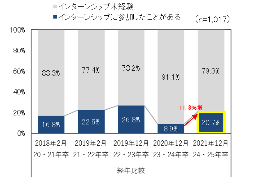 - 大学1、2年生のインターンシップの参加経験割合は20.7%(前年比11.8pt増)で前年度から大きく回復【図1、2】