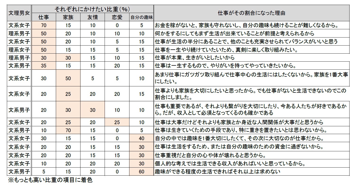 【図6】<仕事・家族・友情・恋愛・自分の趣味>にかけたい比重と、「仕事」がその割合になった理由(1,017名の学生コメントより抜粋)