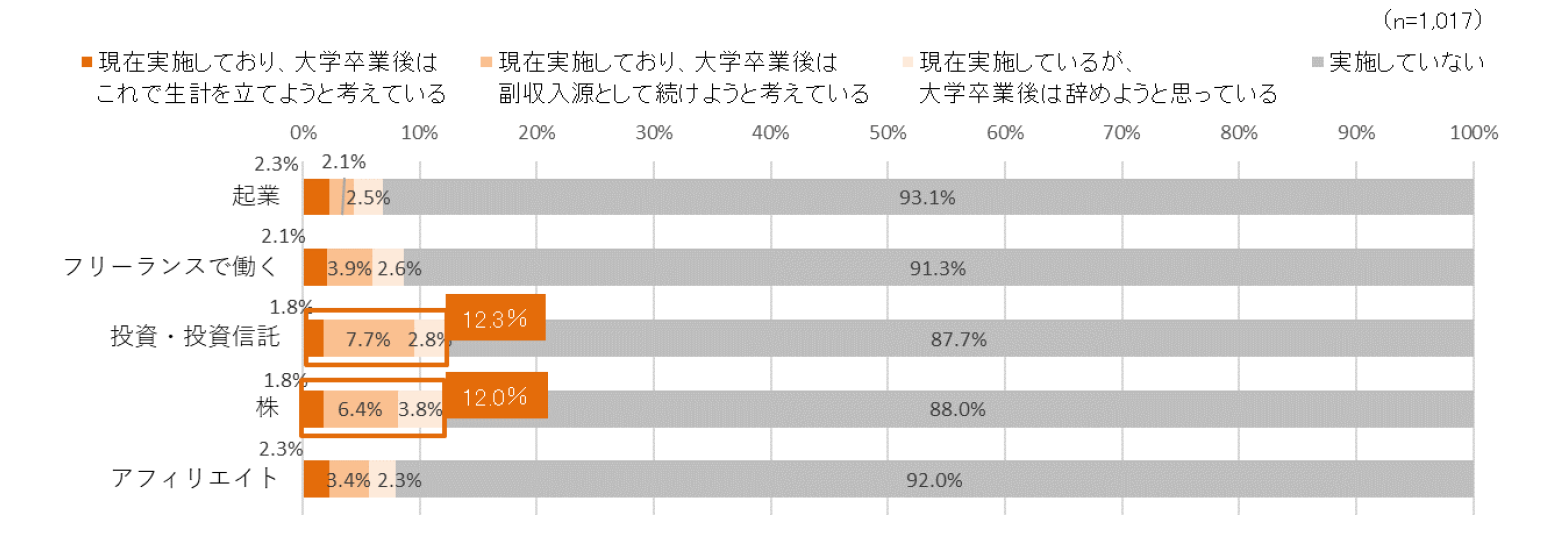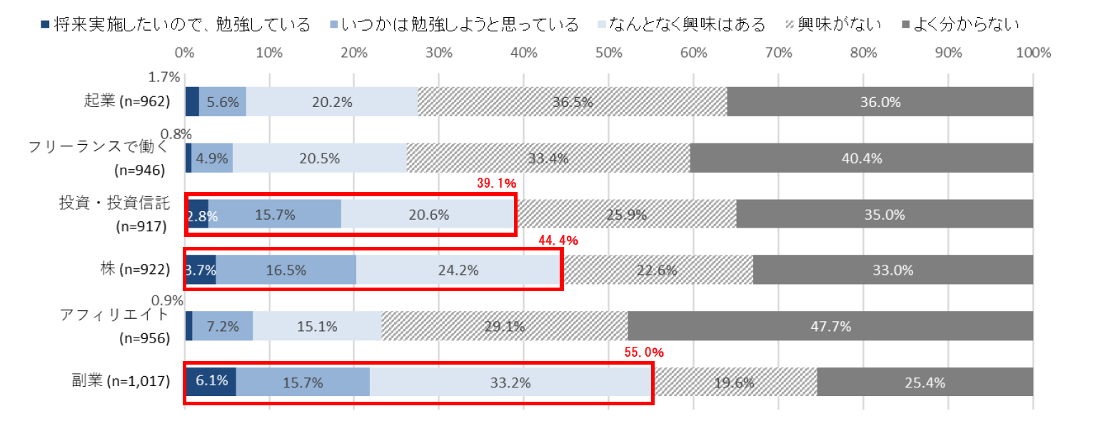 働き方や資産の増やし方について聞いたところ、「投資・投資信託している」は12.3%、「株式投資している」が12.0%であった。また、現在「実施していない」学生に対して興味の有無を聞いたところ、投資・投資信託に興味があるのは39.1%、株に興味があるのは44.4%だった(「将来実施したいので勉強している」「いつかは勉強しようと思っている」「なんとなく興味がある」の合計)。また、全体で副業に興味がある割合は55.0%だった。【図3、4】
