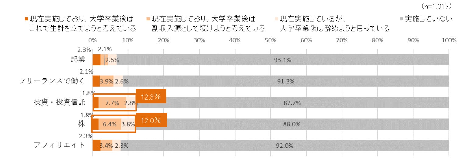【図4】働き方・資産の増やし方についての興味(それぞれ「現在実施していない」学生が回答 ※副業は全員が回答)