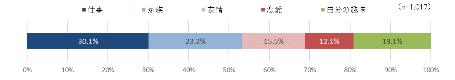 - 社会人になったあとの人生において、「仕事」「家族」「友情」「恋愛」「自分の趣味」の5つのうち、「仕事」におく比重が最も高く約3割。一方で、「仕事はほどほどにやりたい」「趣味が一番大事」という学生も【図5、6】