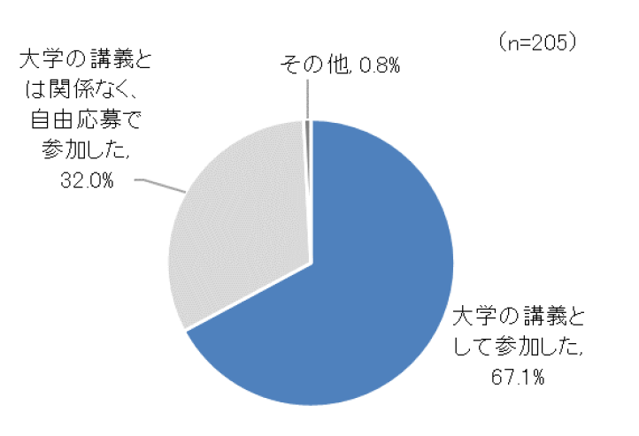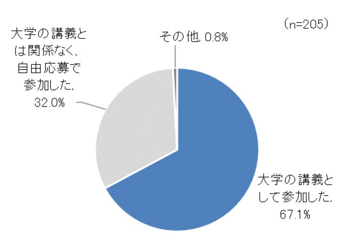 大学1、2年生の12月時点でのインターンシップ経験者は、対前年比11.8pt増の20.7%だった。2020年は新型コロナウイルス感染拡大の影響をうけ、大学の授業開始が延期された分、夏季休業が短縮されたり、大学主催のインターンシップが中止されるなどして参加経験者の割合が低下した。今回の調査では、「参加経験がある」と回答した学生のうち67.1%が「大学の講義として参加した」と回答していることから、2021年は大学の工夫などによって参加経験割合が回復したことが分かる。【図1、2】
