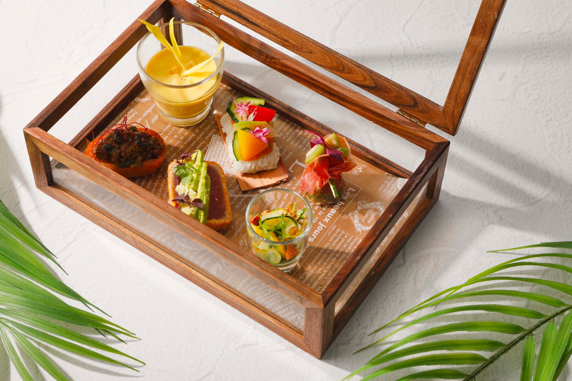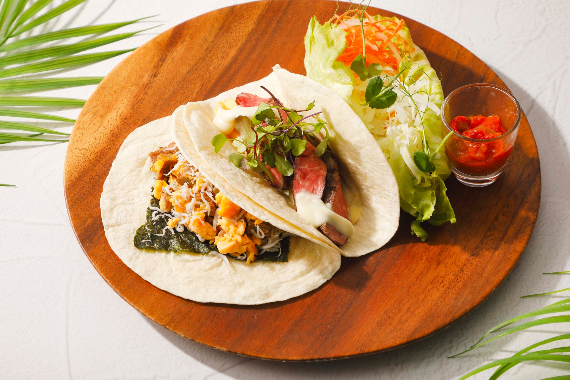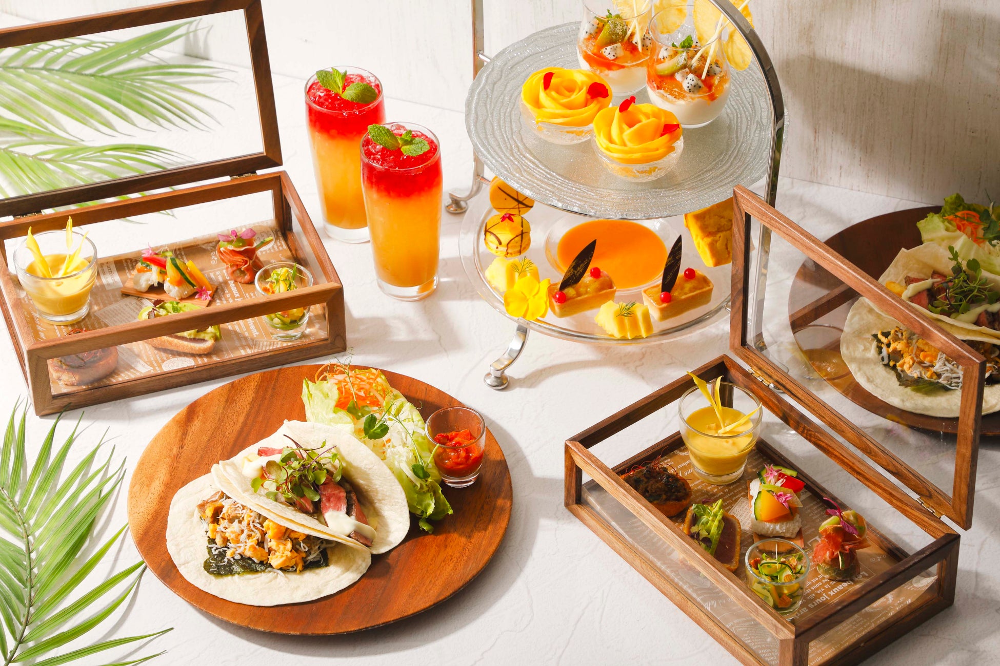 夏に旬を迎える食材を中心に、味、香り、食感を楽しんでいただける色鮮やかなハイティーに仕上げました。中でもメインとなる3種の変わり種タコス「ほねくとシラスのスクランブルエッグ」は、オリジナルで考案し、ほねくの旨みや素材の食感などをアクセントとしております。デザートにはトロピカルフルーツをあしらい、和歌山の梅ジャムなどを合わせた夏にぴったりの5種をご提供いたします。