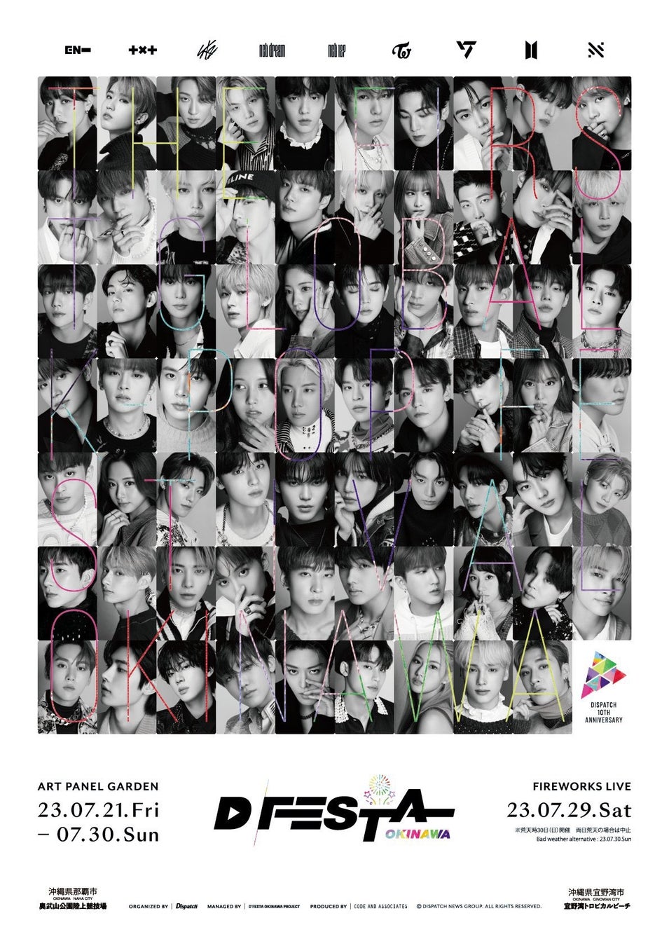韓国芸能ニュースメディア”Dispatch(ディスパッチ)”の創立10周年を記念し、世界で活躍する9つのK-POPグループ=計69名(ENHYPEN、TXT、STRAY KIDS、NCT DREAM、NCT 127、TWICE、SEVENTEEN、BTS、NU'EST) のオリジナルコンテンツが集結した奇跡のK-POPフェス「D'FESTA」。日本での開催は昨年の東京の2カ所、大阪に続き4カ所目となる「沖縄」の地で、2023年7月21日(金)から7月30日(日)までの期間、光文社をはじめとした「D’FESTA OKINAWA PROJECT」が運営するK-POPフェス「D'FESTA 展覧会・花火ライブin沖縄」が開催することが決定しました。