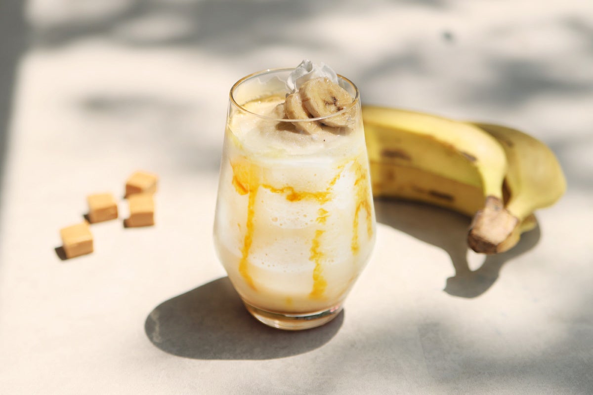 バナナと練乳のフラッペに、キャラメルソースで深い甘みをプラス