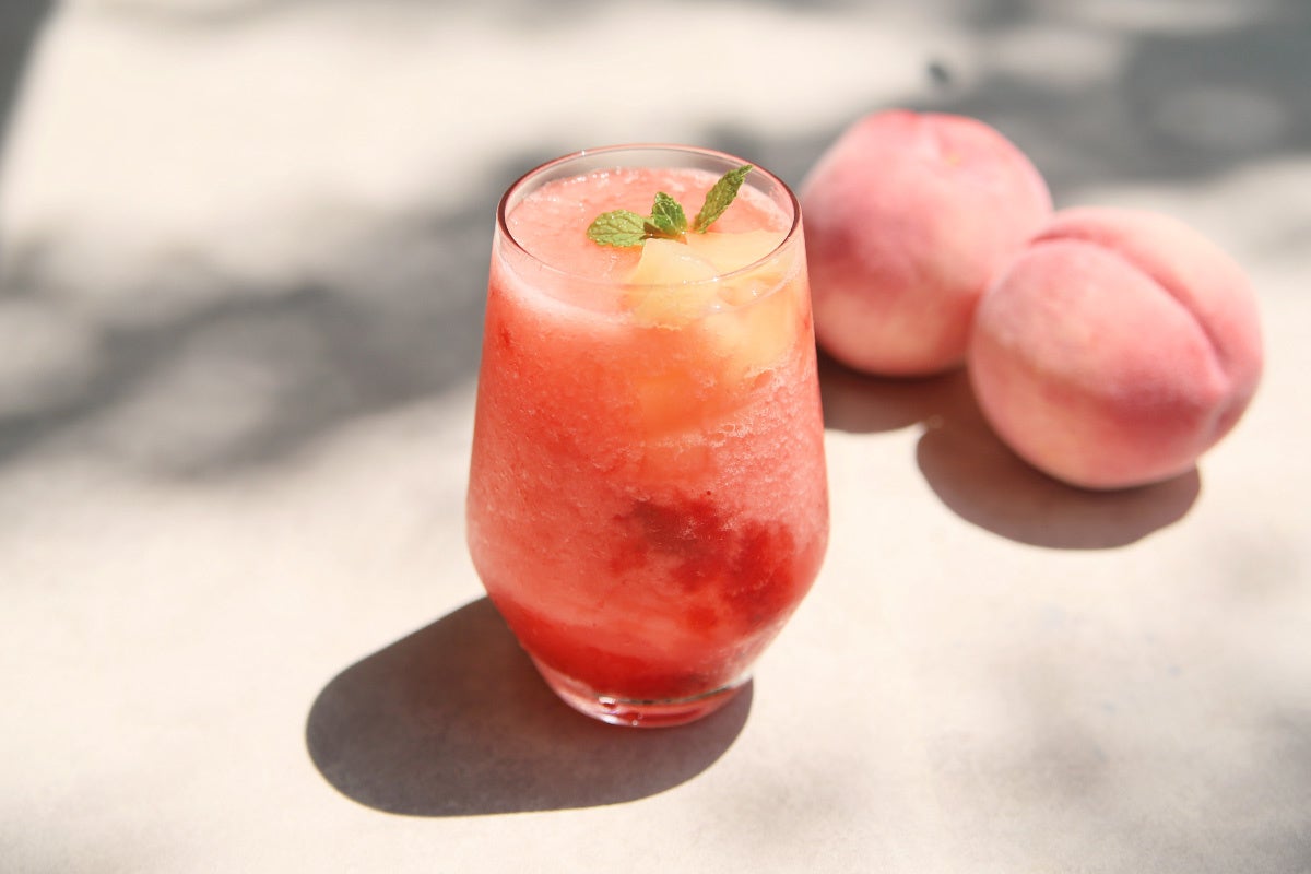 白桃の果肉入りのフラッペに、ストロベリーソースの甘さがマッチした爽やかな味わい