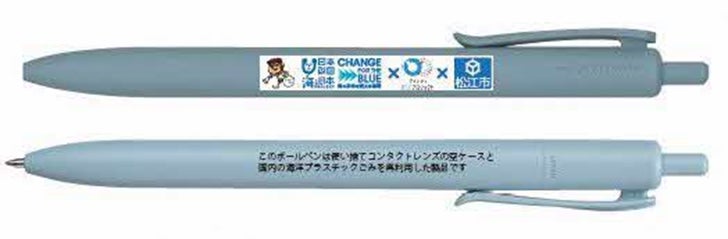 このボールペンは使い捨てコンタクトレンズの空ケースと国内の海洋プラスチックごみを再利用した製品(三菱鉛筆株式会社:新開発)で、今回プロジェクトで連携したHOYA株式会社 アイケアカンパニーの「アイシティ ecoプロジェクト」ロゴと松江市の市章、CHANGE FOR THE BLUEとしまね実行委員会の公式キャラクターをデザインしています。