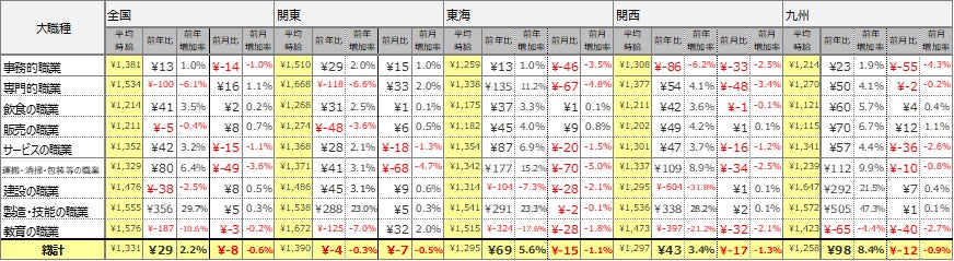 事務的職業は1,381円(前年比13円増、前月比14円減)、専門的職業は 1,534円(前年比100円減、前月比16円増)、飲食の職業は1,214円(前年比41円増、前月比2円増)、販売の職業は1,211円(前年比5円減、前月比8円増)、サービスの職業は1,352円(前年比42円増、前月比15円減)、運搬・清掃・包装等の職業は1,329 円(前年比80円増、前月比49円減)、建設の職業は1,476円(前年比38円減、前月比8円増)、製造・技能の職業は1,555円(前年比356円増、前月比5円増)、教育の職業は1,576円(前年比187円減、前月比3円減)となりました。