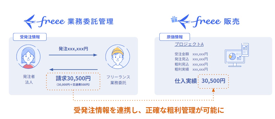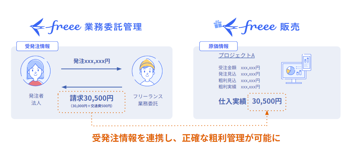 今回、案件・プロジェクト単位で原価計算ができる「freee販売」と連携することにより、企業がフリーランス(業務委託)に支払った人件費や経費を、freee販売上の原価情報の仕入実績に連動することでより正確な粗利管理が可能になります。