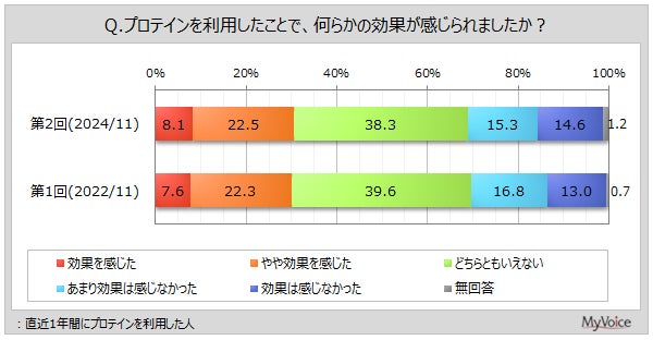 【プロテインに関する調査】直近1年間にプロテインを利用した人は2割弱。そのうち、効果を感じた人は3割強。女性50代では、効果を感じなかった人の比率高い