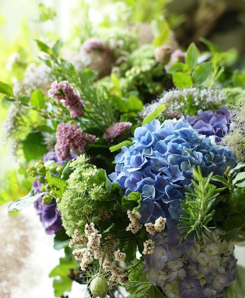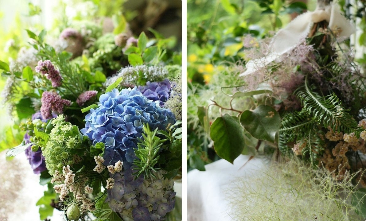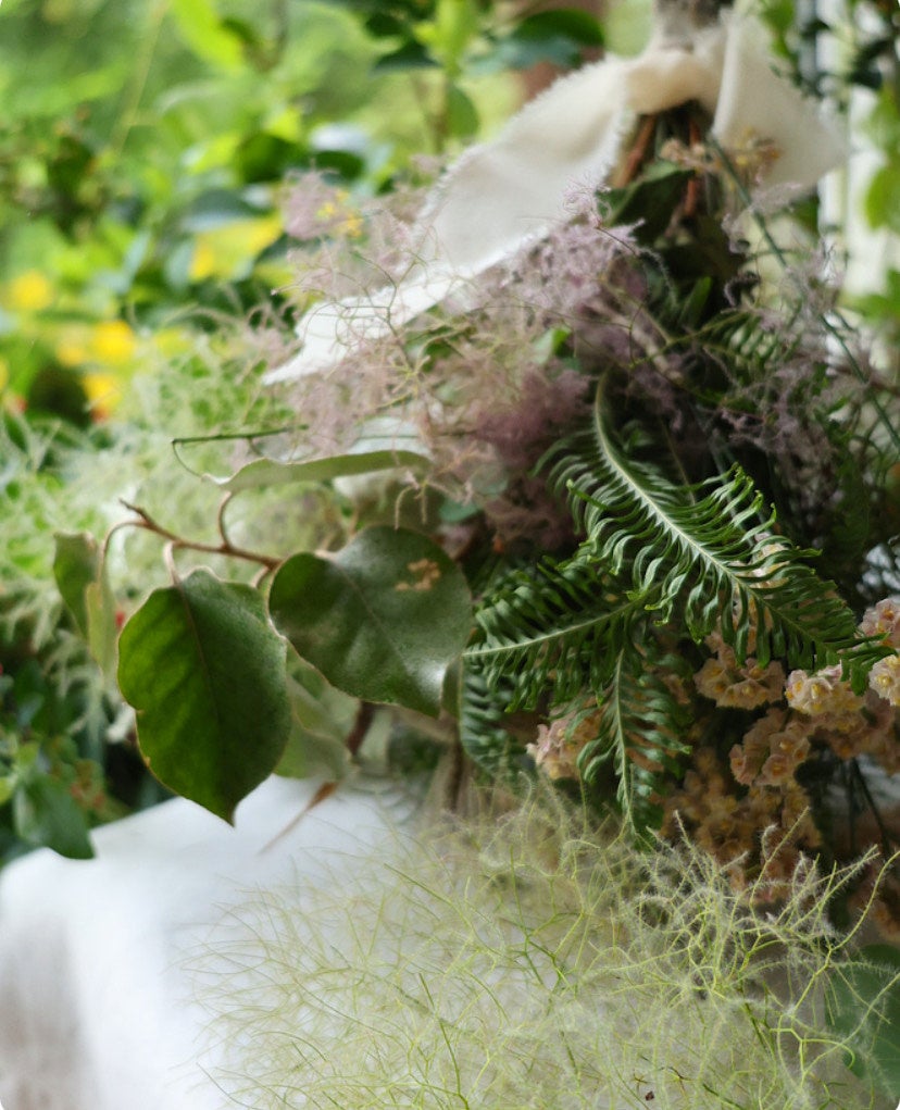 紫陽花と初夏の枝葉や実物を束ねたブーケ、またはスモークツリーとシダ、リモニュームのスワッグを作ります。