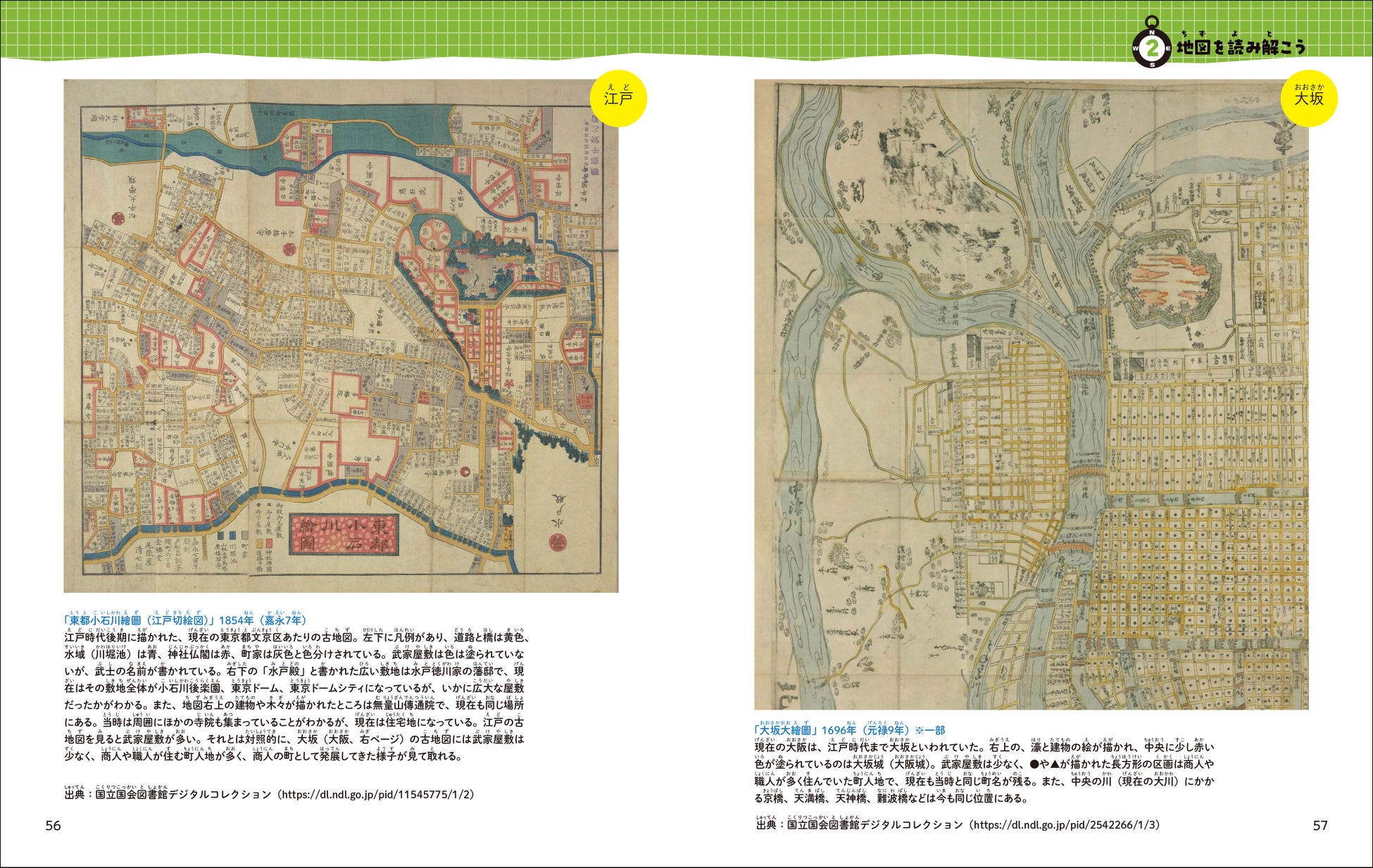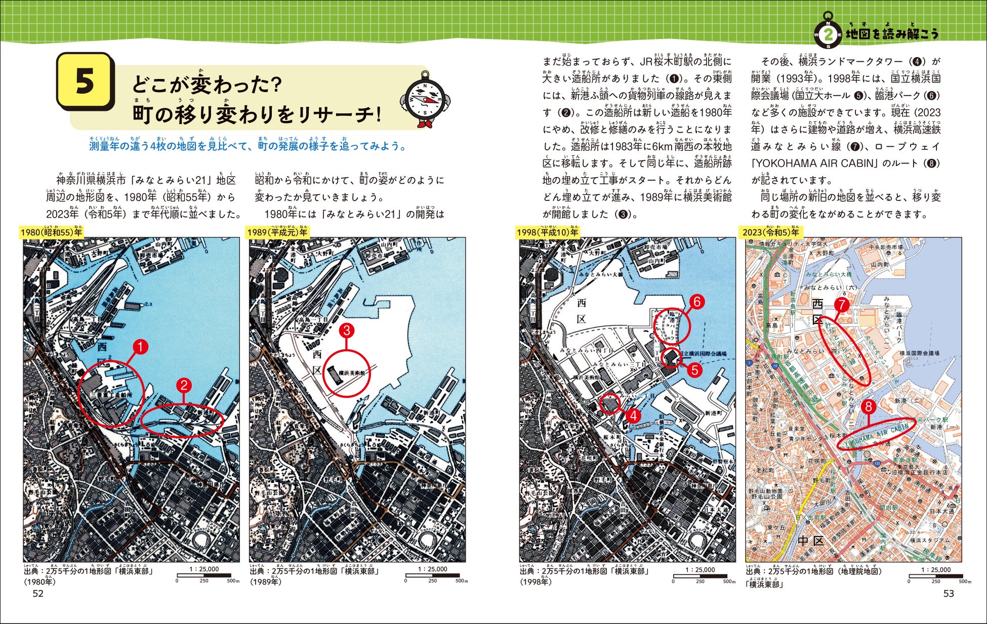 また、地図の情報を読み解くページでは、今と昔の地図を見比べることでどんなことがわかるのか、謎解きにも挑戦!