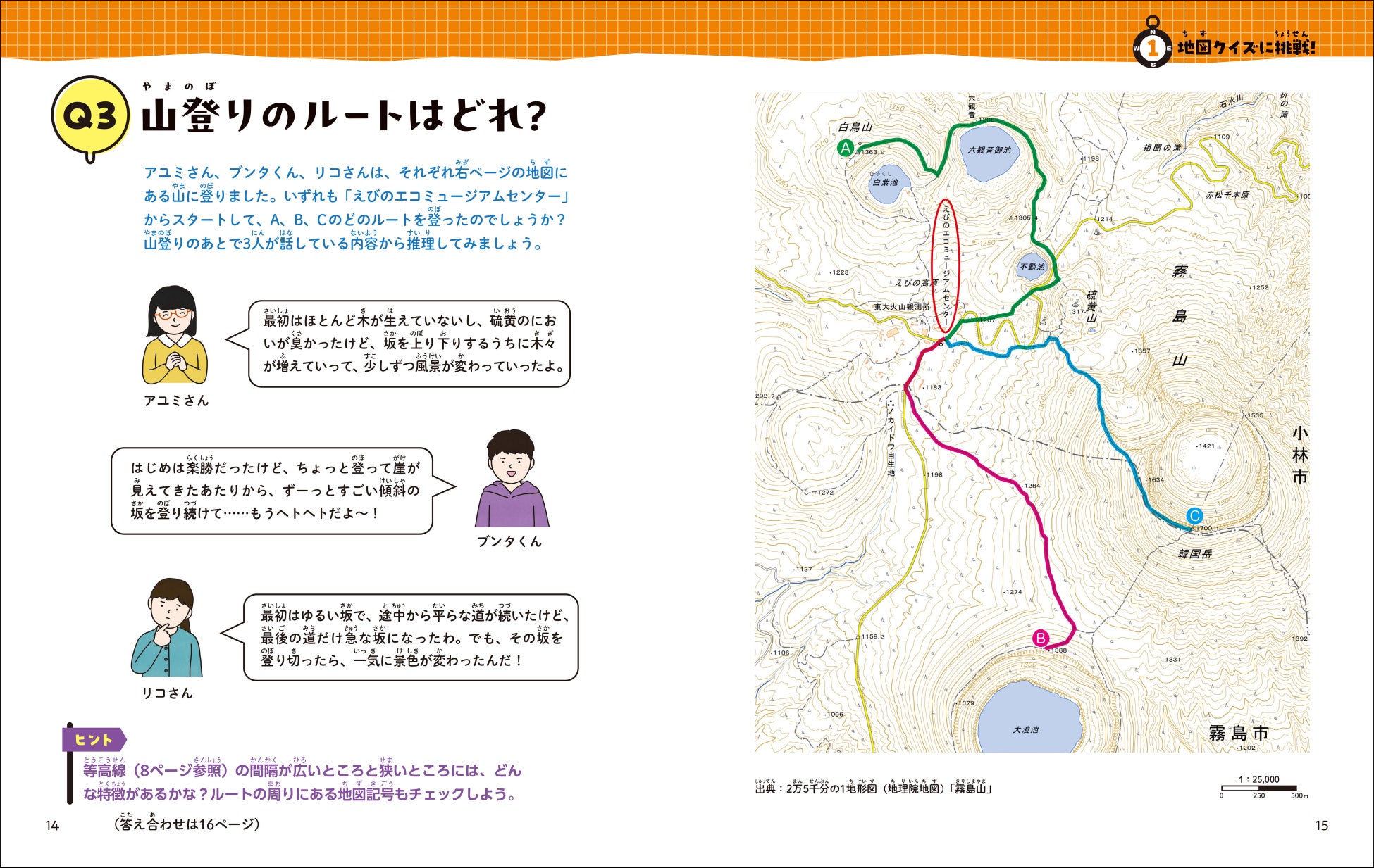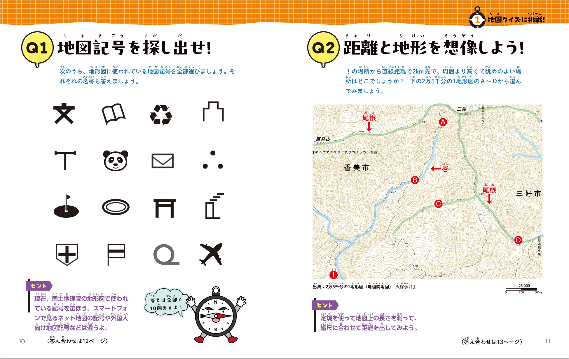 本書では、地図に描かれている地図記号や等高線などの基礎知識をクイズ形式で紹介。