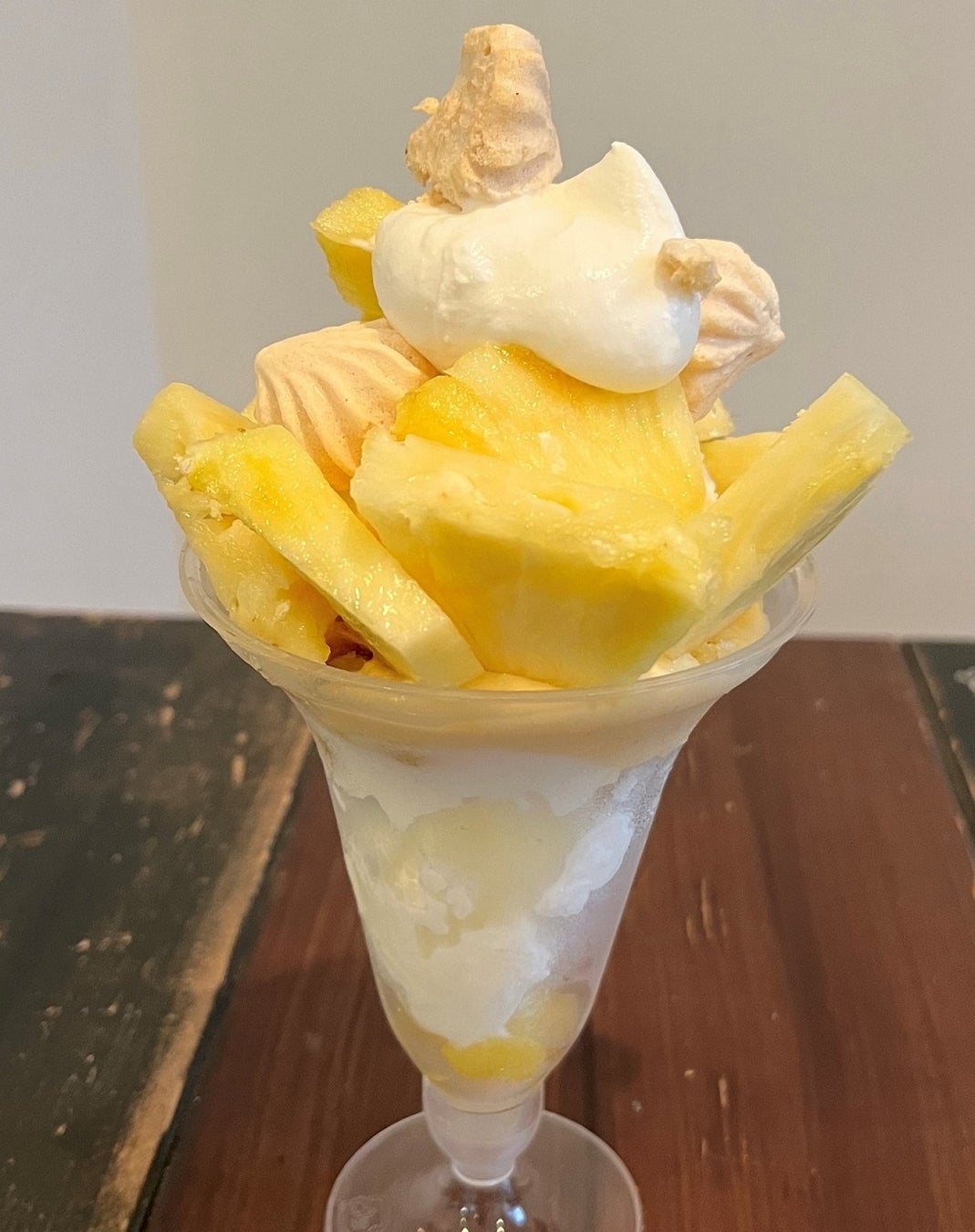 鮮度が命の自家製アイスクリームは、できたてを-40℃の冷凍庫でギュッと凍結し、低温保存。ミルクアイスやヨーグルトアイスにパイナップルを盛り込んで、メレンゲのサクサク食感もプラス。夏にぴったりな爽やかな味わいです。