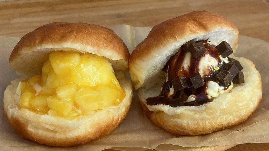 あたたかいマラサダドーナツに、パイナップルアイスをサンドし、マンゴーソースをとろりとかけて。アツアツ、ふわふわ、ひんやり、ひとつでいろいろ楽しめるおいしさです。ほかに、チョコソースのフレーバーもご用意しています。