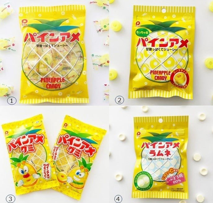 定番の“パインアメ”から、1粒を半分の大きさにした“ちっちゃなパインアメ”、“パインアメ”の味わいをラムネで再現した“パインアメラムネ” 、“パインアメ” をそのままグミにした “パインアメグミ” など、様ざまなバリエーションに進化を遂げた“パインアメ”シリーズが揃います!