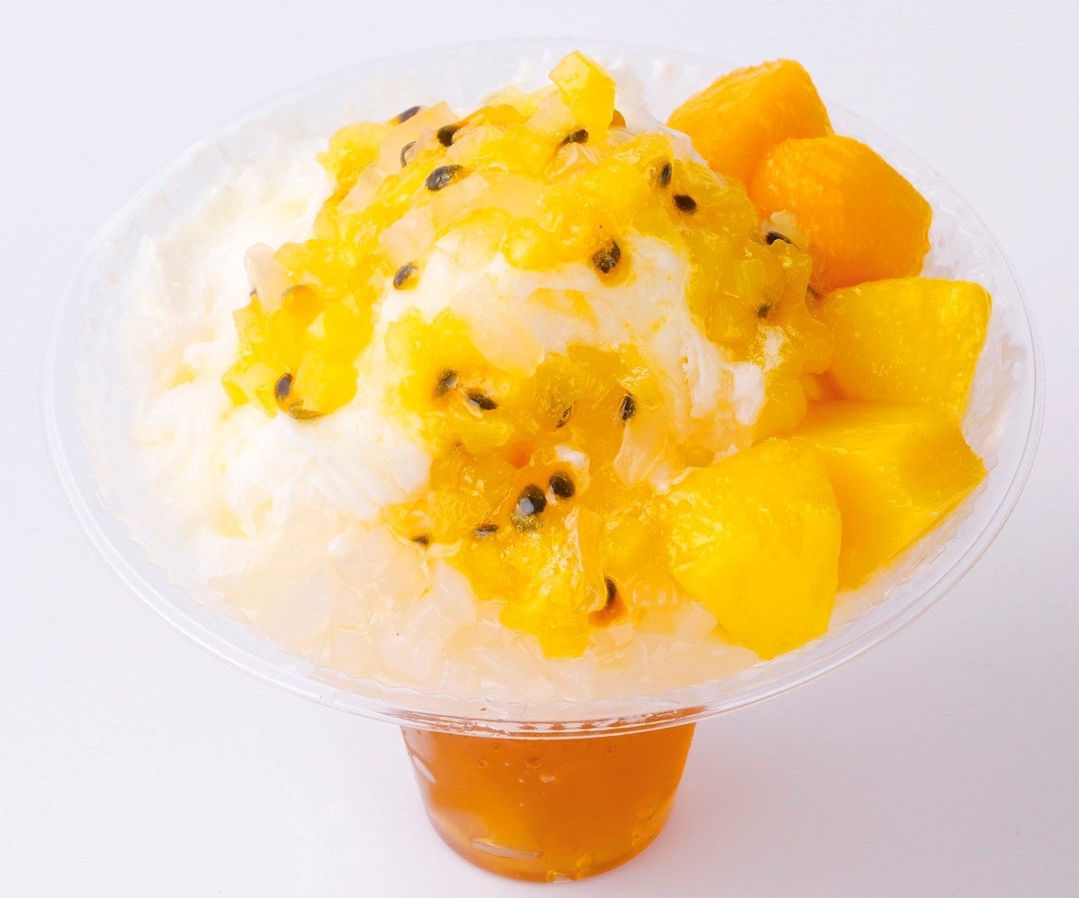 ふわっふわの雪のような口どけのミルク味の “ 台湾かき氷 ” に、パイナップルとパッションフルーツのソースをかけ、パイナップル果肉 、マンゴー果肉、ナタデココ、ジャスミン茶ゼリーを添えた、さっぱりとお召し上がりいただけるかき氷です。