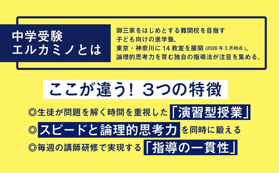 首都圏に14教室を構え、塾生の半数が御三家をはじめとする難関中学に合格するという、驚異的な実績を誇るエルカミノ。筑駒、開成、麻布、桜蔭――名だたる難関校への合格者を輩出し続け、受験のプロたちが注目する「話題の塾」です。その独自のメソッドは大きく3つ。「演習型授業」「スピードと論理的思考力を同時に鍛える訓練」「全講師が毎週研修を受けることで実現する指導の一貫性」です。