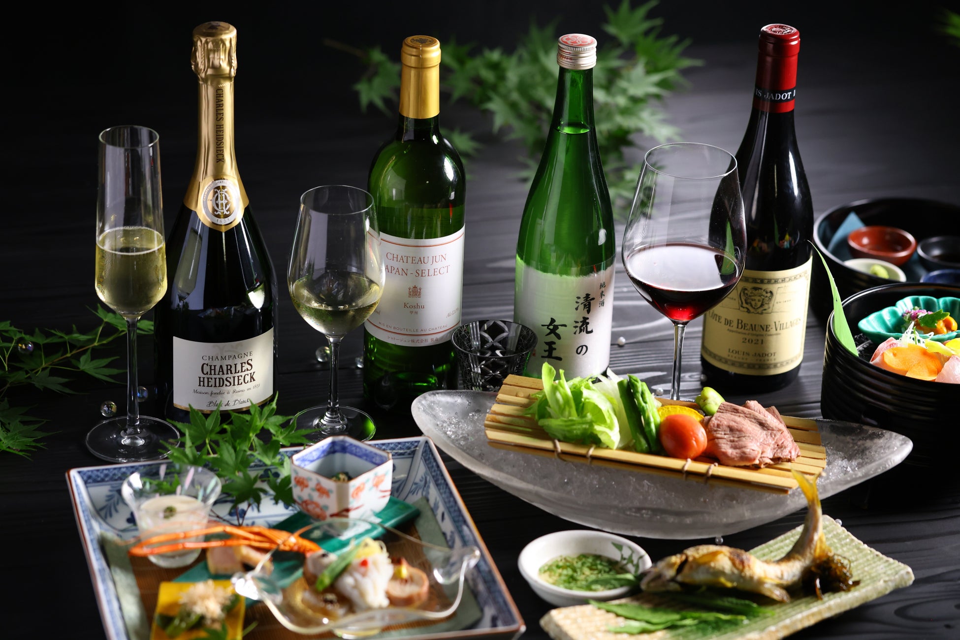夏の夕暮れや天空を覆う青紅葉、木々をすり抜ける風の音などの納涼を、旬の食材や器で表現いたしました。