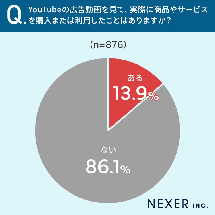 13.9%の方がYouTubeの広告動画を見て、実際に商品やサービスを購入または利用したことが「ある」と回答しています。