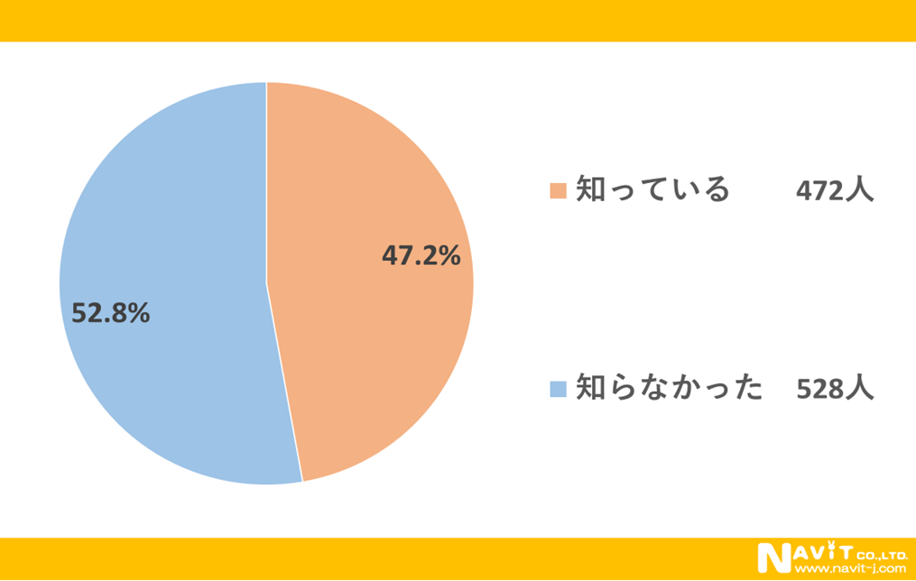 共同親権が2026年までに施行されるということを知っていますか?というアンケートに対して、「知っている」と回答された人が47.2%で「知らなかった」と回答された人は52.8%という回答になりました。