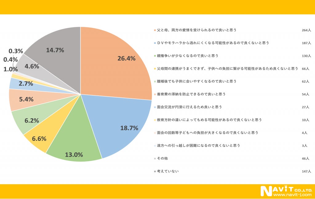 共同親権について尋ねたアンケートでは「父と母、両方の愛情を受けられるので良いと思う」が26.4%で最も多くなりましたが、2番目にはネガティブな意見で「DVやモラハラから逃れにくくなる可能性があるので良くないと思う」が18.7%となりました。