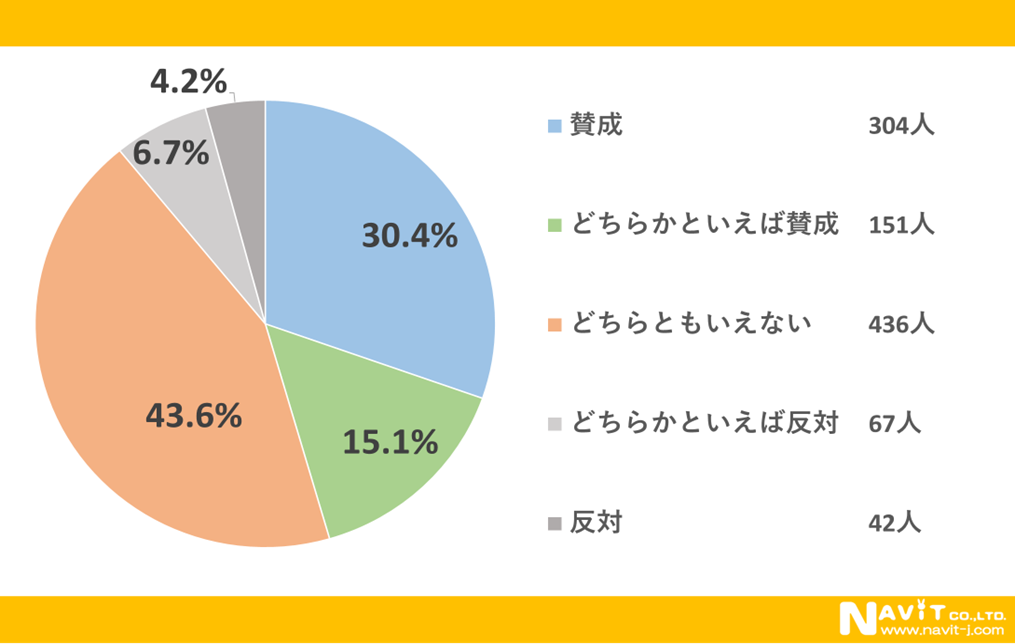 共同親権の賛否について尋ねたアンケートでは、「どちらとも言えない」が一番多く43.6%という結果になりました。続いて「賛成」が30.4%、「どちらかといえば賛成」が15.1%という結果になりました。