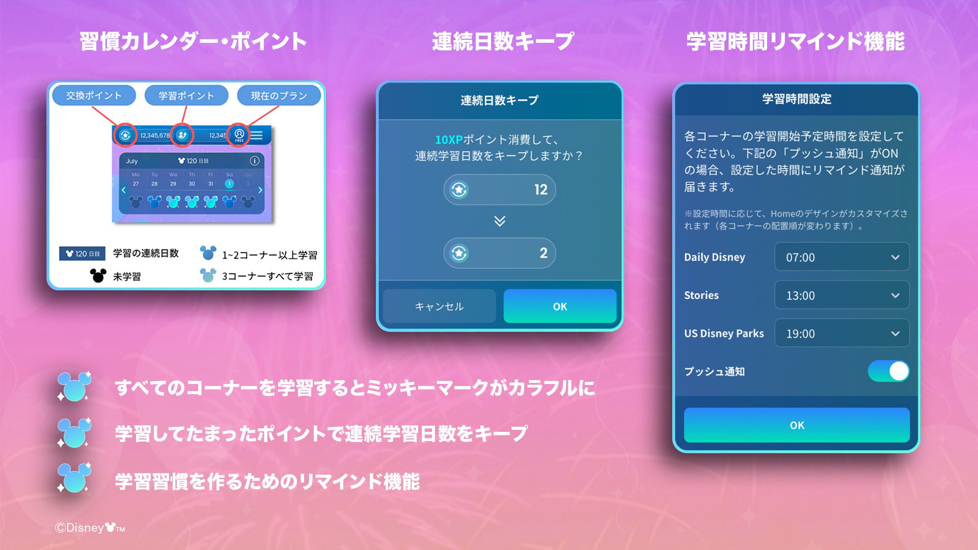 本アプリは、ディズニー作品とピクサー作品で英語の4技能を学べる「Stories」、アメリカのカリフォルニア ディズニーランド・リゾートとフロリダ ウォルト・ディズニー・ワールド・リゾートを舞台にしたリアルな英会話ができる「US Disney Parks」、ディズニーの名言やトリビアなど心ときめく英語に毎日触れる「Daily Disney」の3つのコーナーで構成されています。メインの3つのコーナーとアプリ学習の利点を融合させ、英語学習の習慣化をサポートいたします。