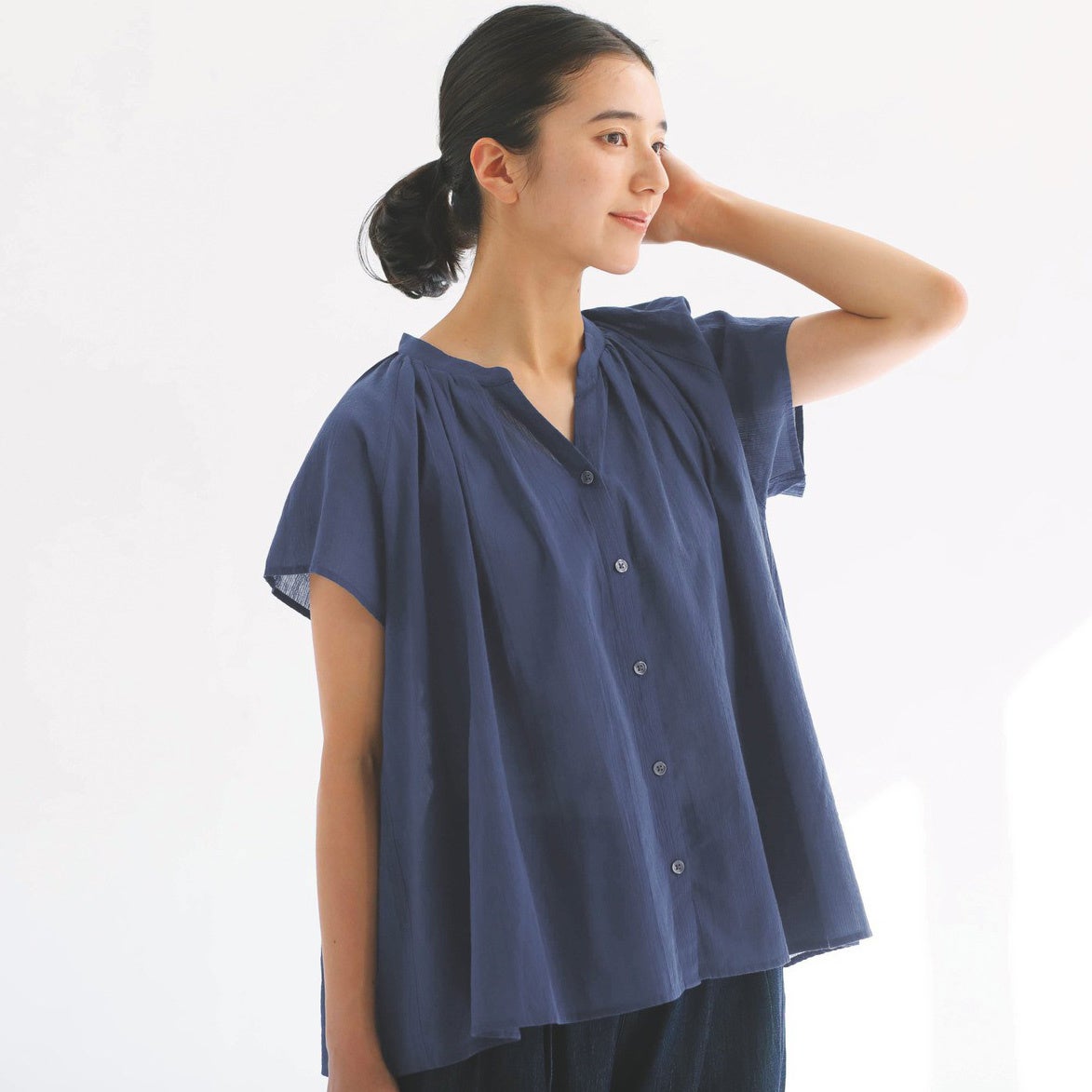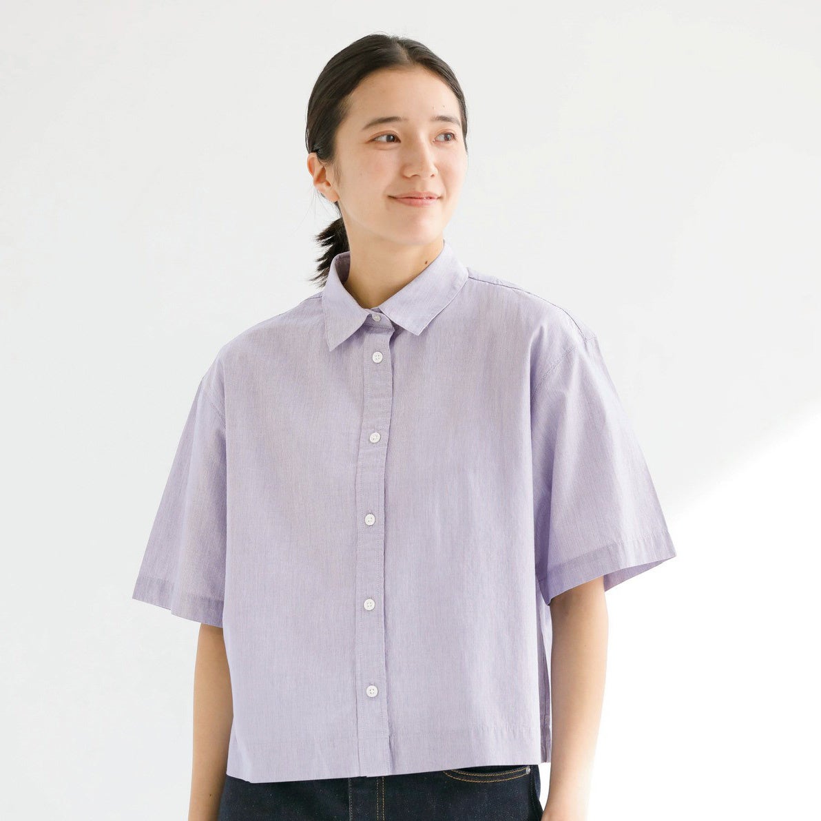 布帛のシャツやワンピースの“涼感ブロード”アイテムは、綿100%の糸を強く撚った強燃糸や紡績方法を工夫した混紡糸を使用することで、生地に張りがあり、さらりとして肌離れがよく、自然な接触冷感性を持たせています。見た目にも清涼感がある生地です。