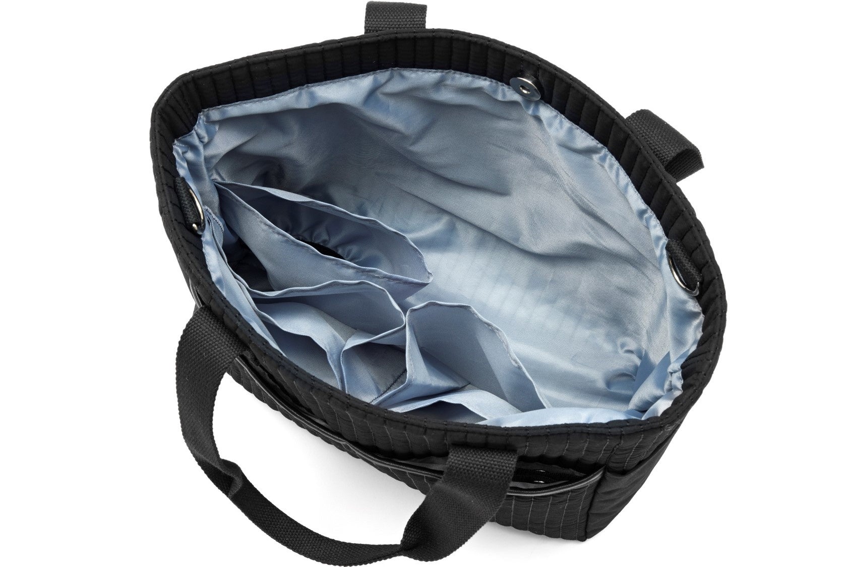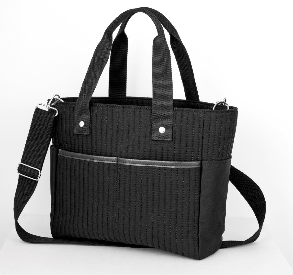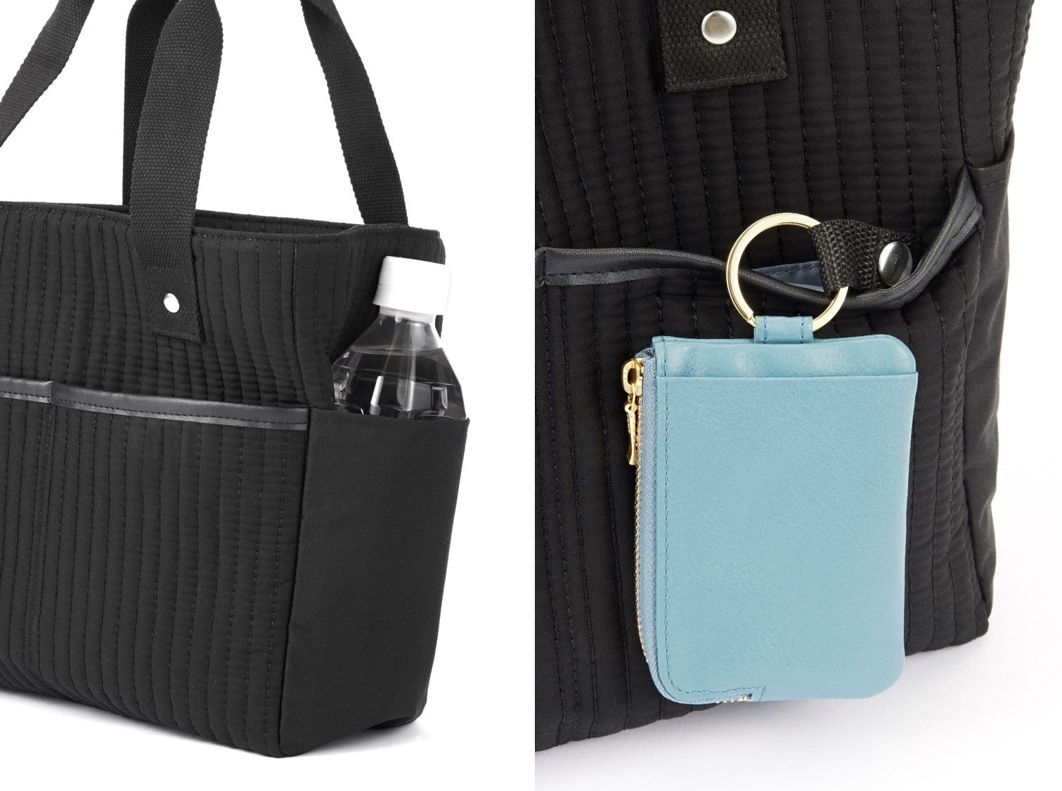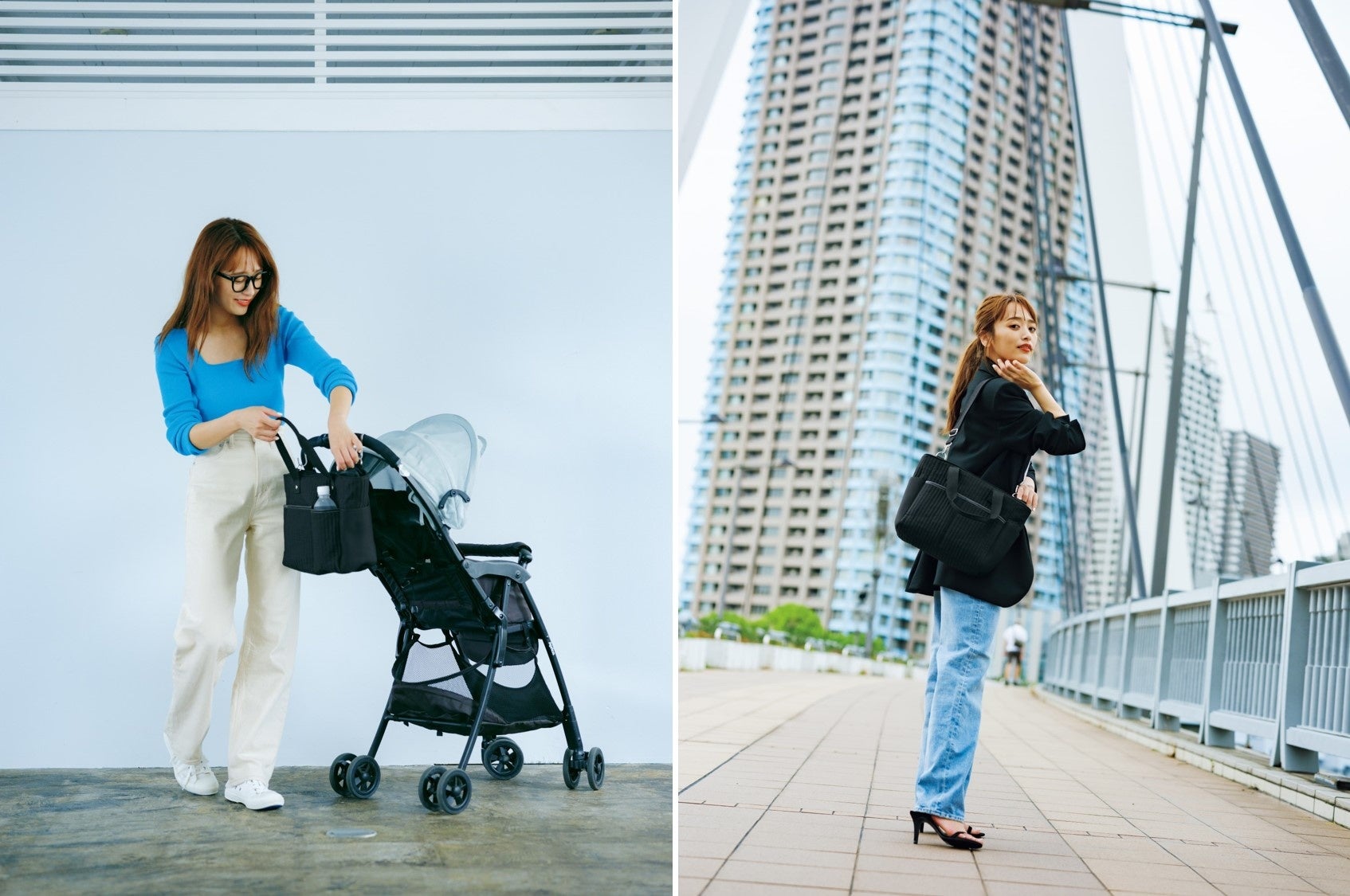 テレビでは情報番組からバラエティ番組まで幅広く活躍、ファッション誌や育児雑誌ではモデルとして引っ張りだこ、SNSの総フォロワー数は350万人超の近藤千尋さん。2児の母でもある彼女が考案したのは、性別やシーンを問わず誰もが使いやすい、収納力抜群の2WAYバッグです。トレンドとして注目されている縦のキルティング生地をベースにレザー調のパイピングをあしらい、カラーはブラックとシルバーでまとめました。