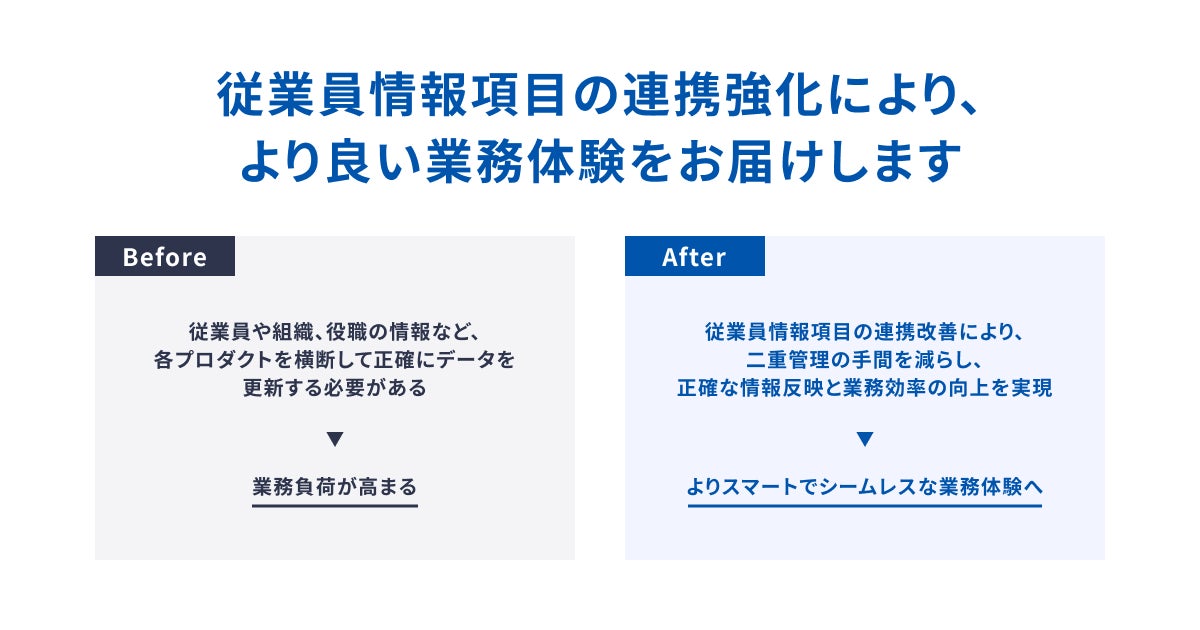 今回の通勤手当の連携改善をスタートとして、様々な従業員情報項目の連携を強化し、二重管理の手間を削減します。今後、「口座情報」「社会保険関連情報」「休業・休職情報」などの項目においても連携強化を予定しています。これにより、正確な情報の反映と業務効率の向上を実現し、より良いユーザー体験を提供することを目指してまいります。