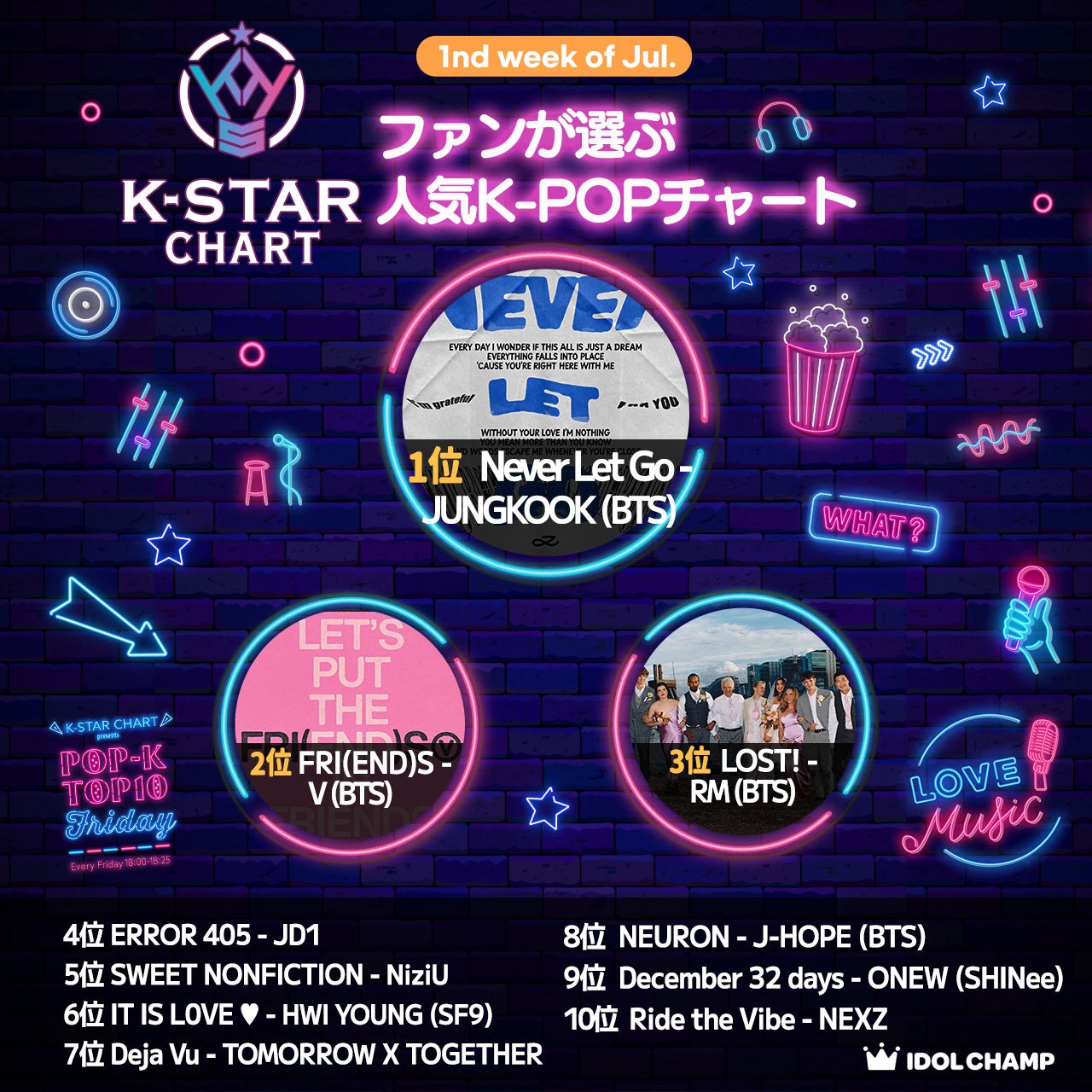 『K-STAR CHART presents POP-K TOP10 Friday』7月5日(金)の放送回において、JUNGKOOKの「Never Let Go」がチャート投票で1位を獲得し、今週のNo.1曲として番組内で放送されました。