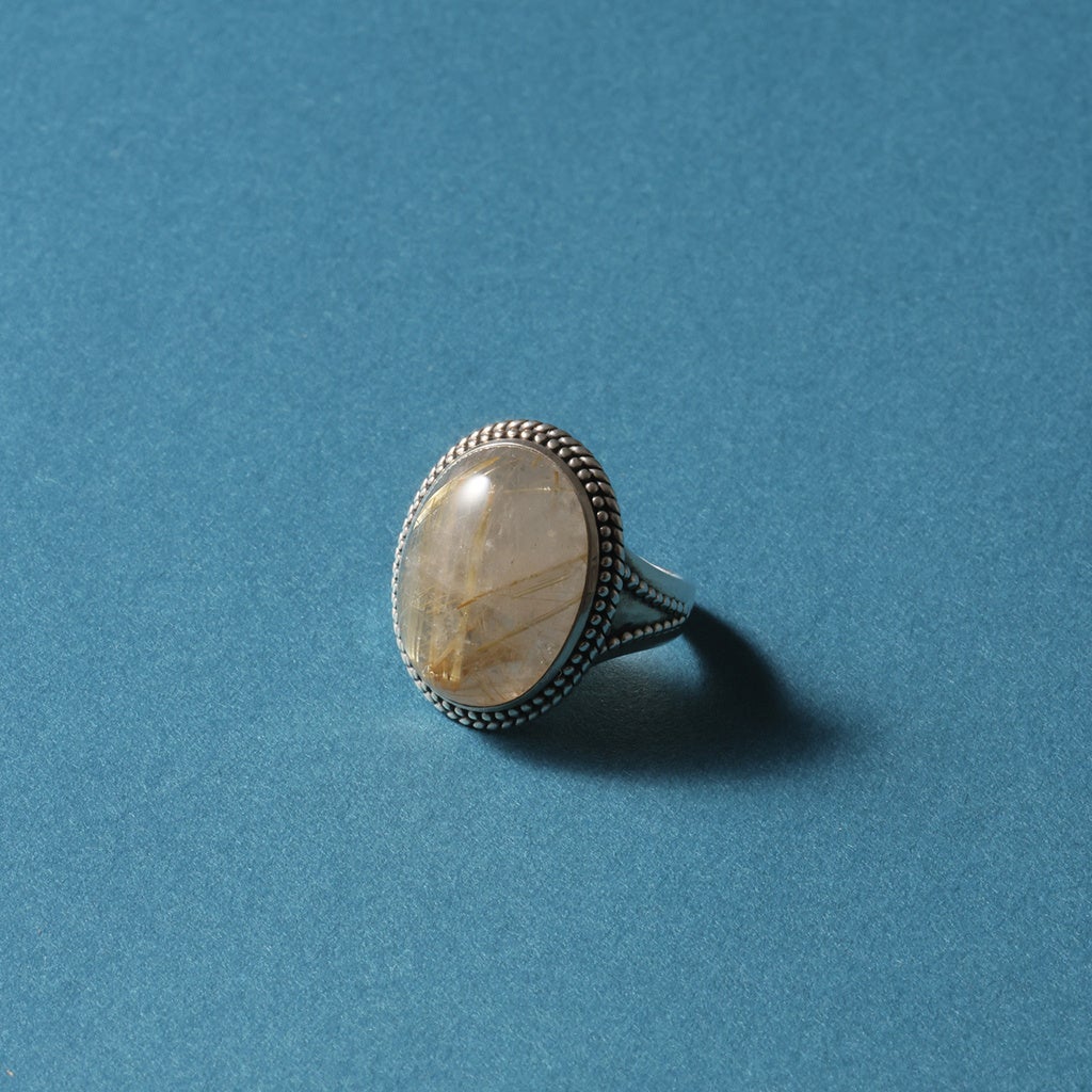 シルバーに大きなルチルクォーツをあしらったリングは、存在感も抜群。