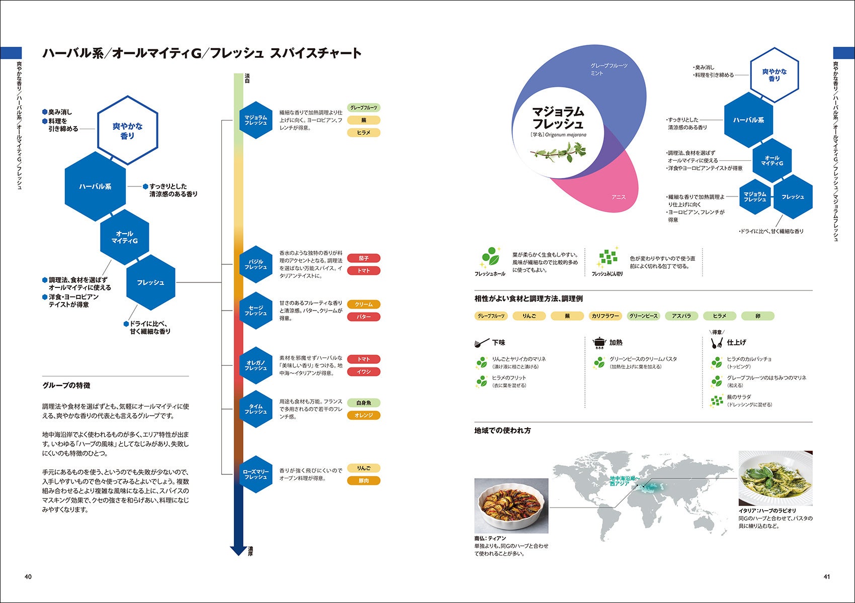 スパイスをロジカルに、視覚的に、解説しているのでグラフを見ながら簡単に理解できます。スパイス全体を俯瞰で見て大まかな特徴を掴み、それを使いたいスパイスに落とし込み、レシピも参考にできるため、スパイス使いの応用力が身につきます。