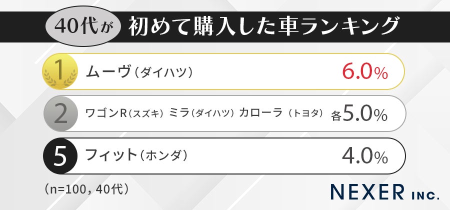 40代が初めて購入した車として「ムーヴ(ダイハツ)」が選ばれた理由には、軽自動車ならではの経済性と実用性の高さが挙げられます。維持費が安く、燃費性能も優れているため、コストを抑えつつ快適に乗れる点が魅力といえるでしょう。