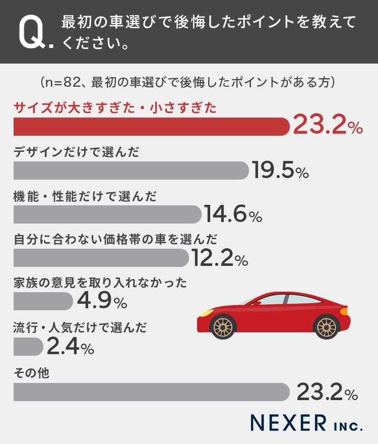 ■最初の車選びで後悔したポイント、23.2%が「サイズが大きすぎた・小さすぎた」