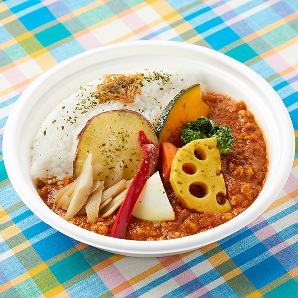 【内容】大豆ミートを使用した、トマトの旨みとスパイスがきいたキーマカレーに、野菜を彩りよくトッピングしました。