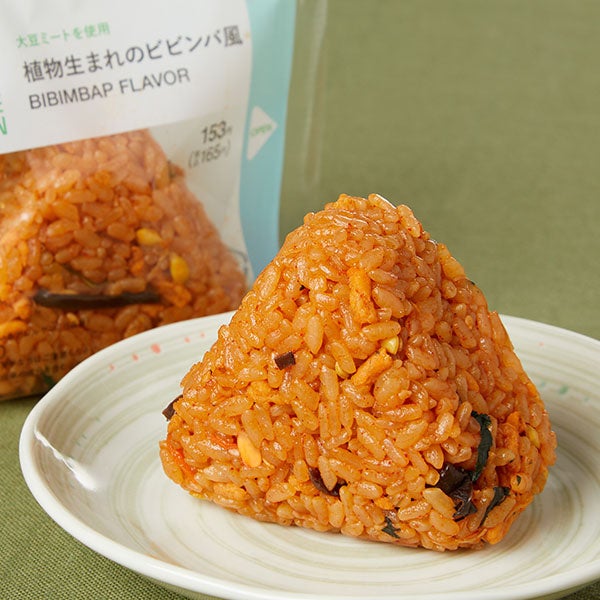 【内容】野菜と大豆ミートをピリ辛のコチュジャンで炒めて、ご飯に混ぜ込んだビビンバ風おむすびです。