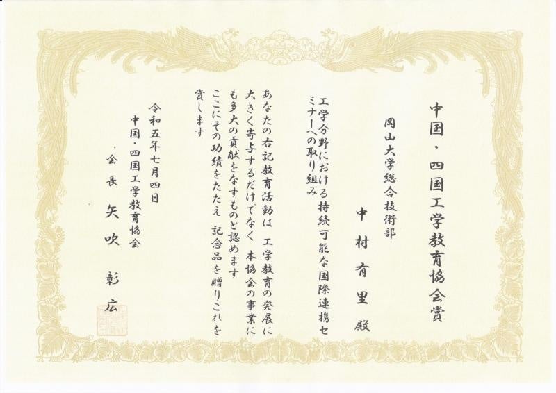 国立大学法人岡山大学(本部:岡山市北区、学長:那須保友)総合技術部教育支援技術課の中村有里技術専門職員が2023年7月4日、これまで工学部で実施してきた「工学分野における持続可能な国際連携セミナーへの取り組み」が評価され、「中国・四国工学教育協会賞」を受賞しました。