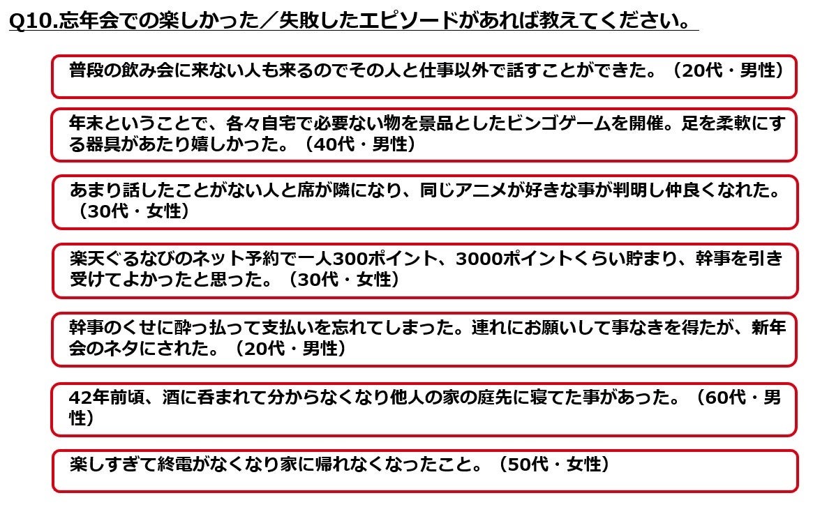 ところで、忘年会のエピソードを自由回答で尋ねたところ、 久々の友人との会話で盛り上がったり、部署や年代の垣根を超えて楽んだり、新たな発見ををしたりする様子が多くみられました。もちろん、失敗談のエピソードもありましたが、忘年会ならではのコミュニケーションは、後になってよい思い出になることが多いのかもしれません。よい思い出を求めに、今年も忘年会を参加してみてはいかがでしょうか。 その際には、40代、50代男性に相談してみると、幹事を引き受けてくれやすいかもしれません。