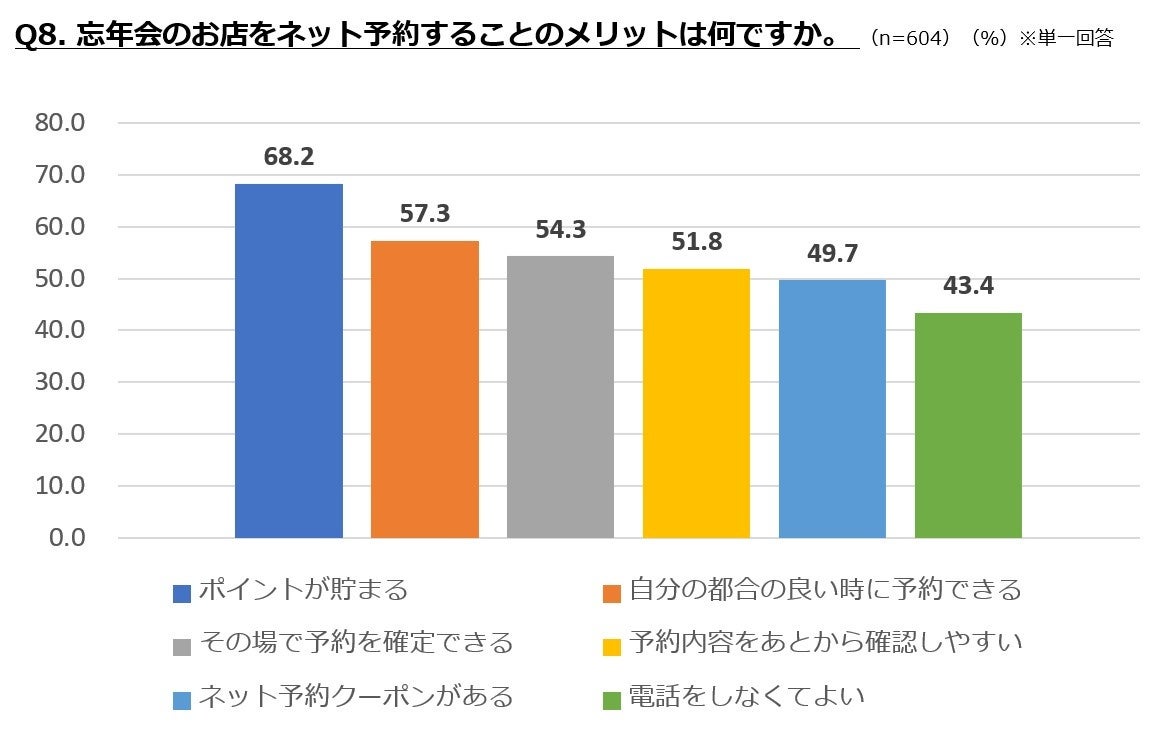 忘年会の幹事を頼まれたらどうするか尋ねると、40代男性では全体より約10ポイント高い35%が「喜んで引き受ける」と回答。50代男性でも33%と、やや高くなりました。忘年会の幹事としてのネット予約の利用意向は96%と、忘年会とネット予約は切っても切れない関係にありそうです。そのメリットとしてあげられるのはやはり「ポイントが貯まる」という点。 「ポイントが貯まる」ことで、幹事を頑張りたいと思ってくれる人がいるのは、「出来れば断りたい」「絶対に断る」という方から見るとありがたい存在かもしれません。