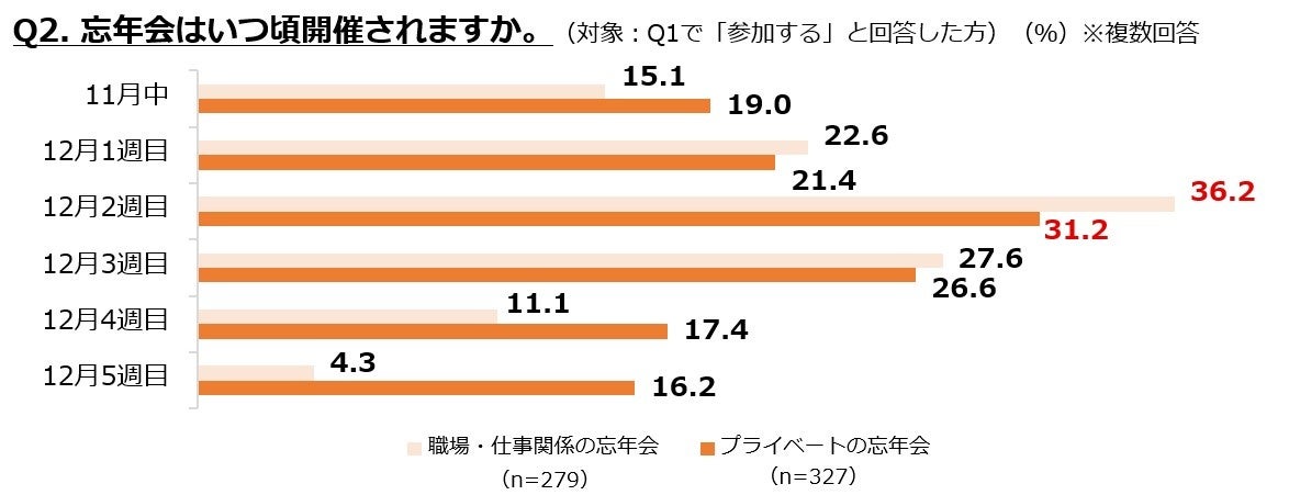 今年の忘年会は、職場・プライベートともに半数以上の参加意向がありました。 忘年会で、何次会まで参加するか尋ねると、職場は「1次会まで」が60%なのに対し、プライベートでは35%にとどまり、職場はスマートにサッと、プライベートは2次会、3次会と長い夜を楽しむという、シーンに合わせたメリハリのある楽しみ方をされる方が多い様子がうかがえました。