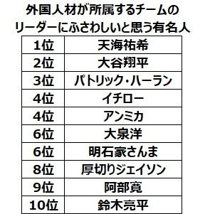 ●「外国人材が所属するチームのリーダーにふさわしいと思う有名人」は、1位「天海祐希」、2位「大谷翔平」、3位「パトリック・ハーラン」