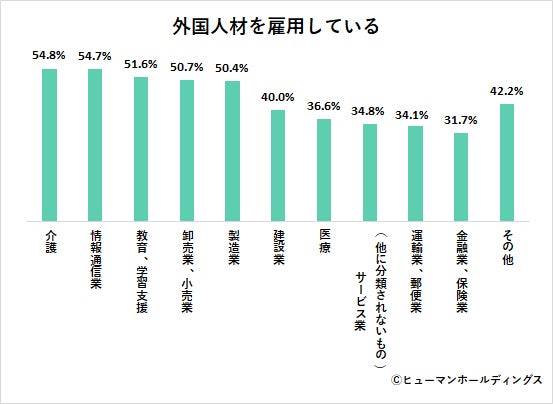 1.外国人材雇用の有無を業種別に見ると、「介護」と「情報通信業」が多く、54%超