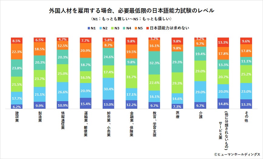 「外国人材を雇用する場合、どのくらいの日本語レベルが最低限必要だと思うか」という質問に対し、全体では、「N3:日常的な場面で使われる日本語をある程度理解することができる(22.9%)」、「N2:日常的な場面で使われる日本語の理解に加え、より幅広い場面で使われる日本語をある程度理解することができる(21.4%)」、「N4:基本的な日本語を理解することが出来る(19.0%)」の順という結果でしたが(外国人材雇用に関する意識・実態調査vol.1)、業種別に比較すると、高い日本語能力レベルを求める(「N1:幅広い場面で使われる日本語を理解することができる」と「N2:日常的な場面で使われる日本語の理解に加え、より幅広い場面で使われる日本語をある程度理解することができる」の合算)業種は、「卸売業・小売業(43.4%)」「介護(38.7%)」「情報通信業(37.5%)」という結果になりました。顧客と直接接する業種や、専門用語を使用しロジカルに業務を進めることが必要とされやすい業種において高い日本語能力が求められている傾向が見られます。