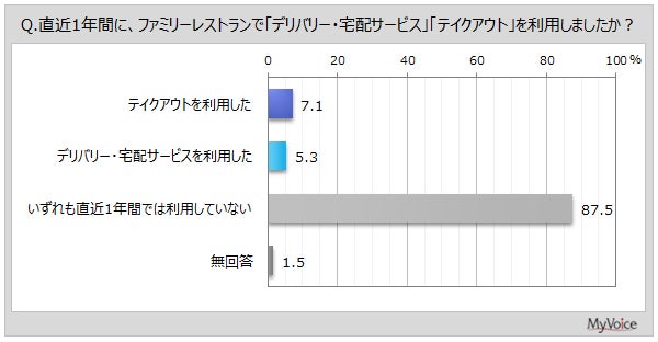 直近1年間にファミリーレストランで「テイクアウト」を利用した人は7.1%、10・20代では約15%となっています。「デリバリー・宅配サービス」を利用した人は5.3%、10~30代では各10%台となっています。