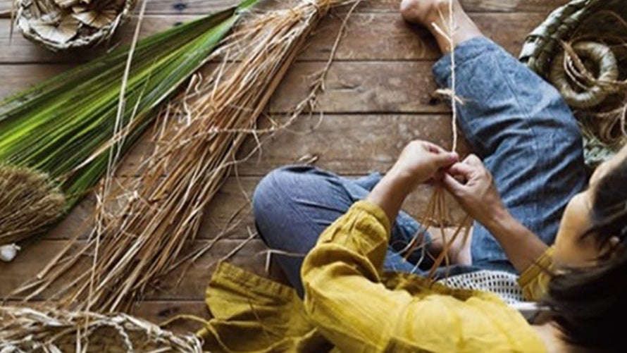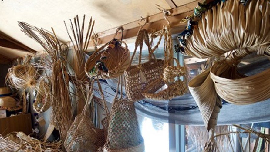 沖縄に昔から伝わる民具を現代風にアレンジした民具ブランド「種水土花(しゅみどか)」。沖縄県に自生するクバや月桃などの植物を使い、ひとつひとつ手編みで製作しています。