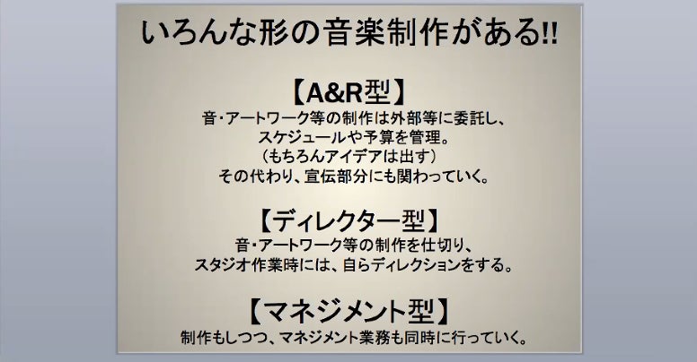 いよいよ、話題は音楽制作について。まずは音楽が世の中に届けられるまで、制作、宣伝&販促、ライブ制作、営業担当、イベンター、メディア、レコード店や配信業者などが関わっていることを説明していきます。制作担当については「いろいろなタイプの方がいて、僕と吉野でも違うので、ざっくり3パターンにまとめてみました。ひとつめはA&R型で、制作のためにプロデューサーを立てて、自身はスケジュールや予算の管理、宣伝のプライニングに重きを置くタイプ。ディレクター型は、スタジオ作業になったら自らディレクションをするタイプ。最後は、マネージメント型で、アーティストのスケジュール管理などマネージメント業務もしながら制作に携わるタイプです」とわかりやすく話します。