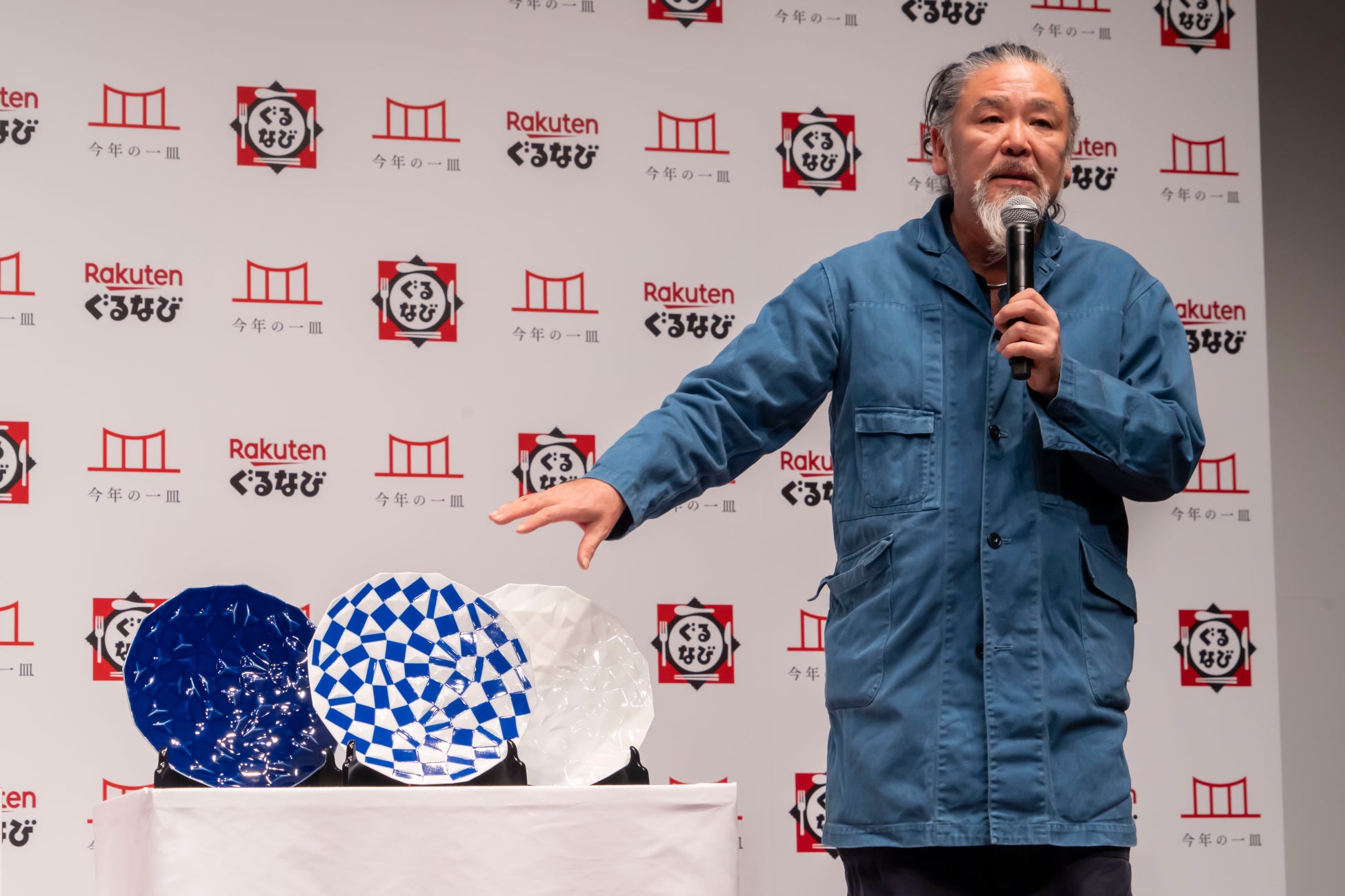 また、記念品の「野老組市松紋様皿 有田焼2025(ところくみいちまつもんようざら ありたやきにせんにじゅうご)」は、本年も美術・建築・デザインの境界領域で活躍されている野老朝雄(ところ・あさお)氏がデザイン。作品に込めた想いを野老氏は、「市松の紋様は60個の大中小の四角でできており、多様な組み合わせが作れる紋様です。ずっとやりたくてできなかった紋様を描かせていただきました」とお話されました。
